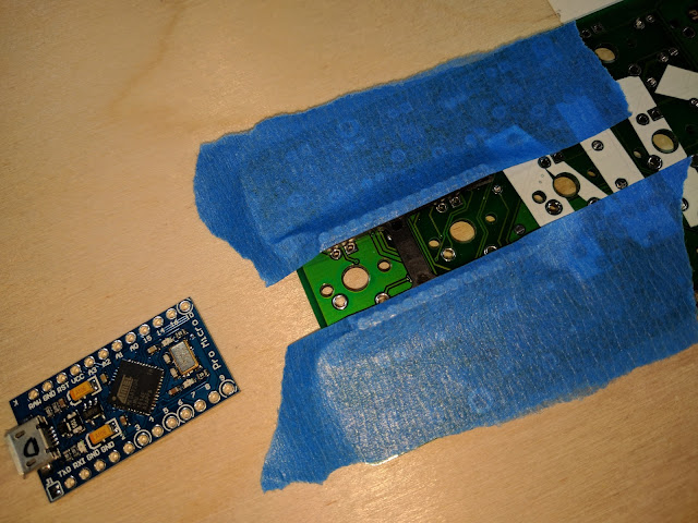 Poke a diode lead through the masking tape through each hole. This will make it easier to place the leads in when the Pro Micro is in place.