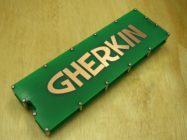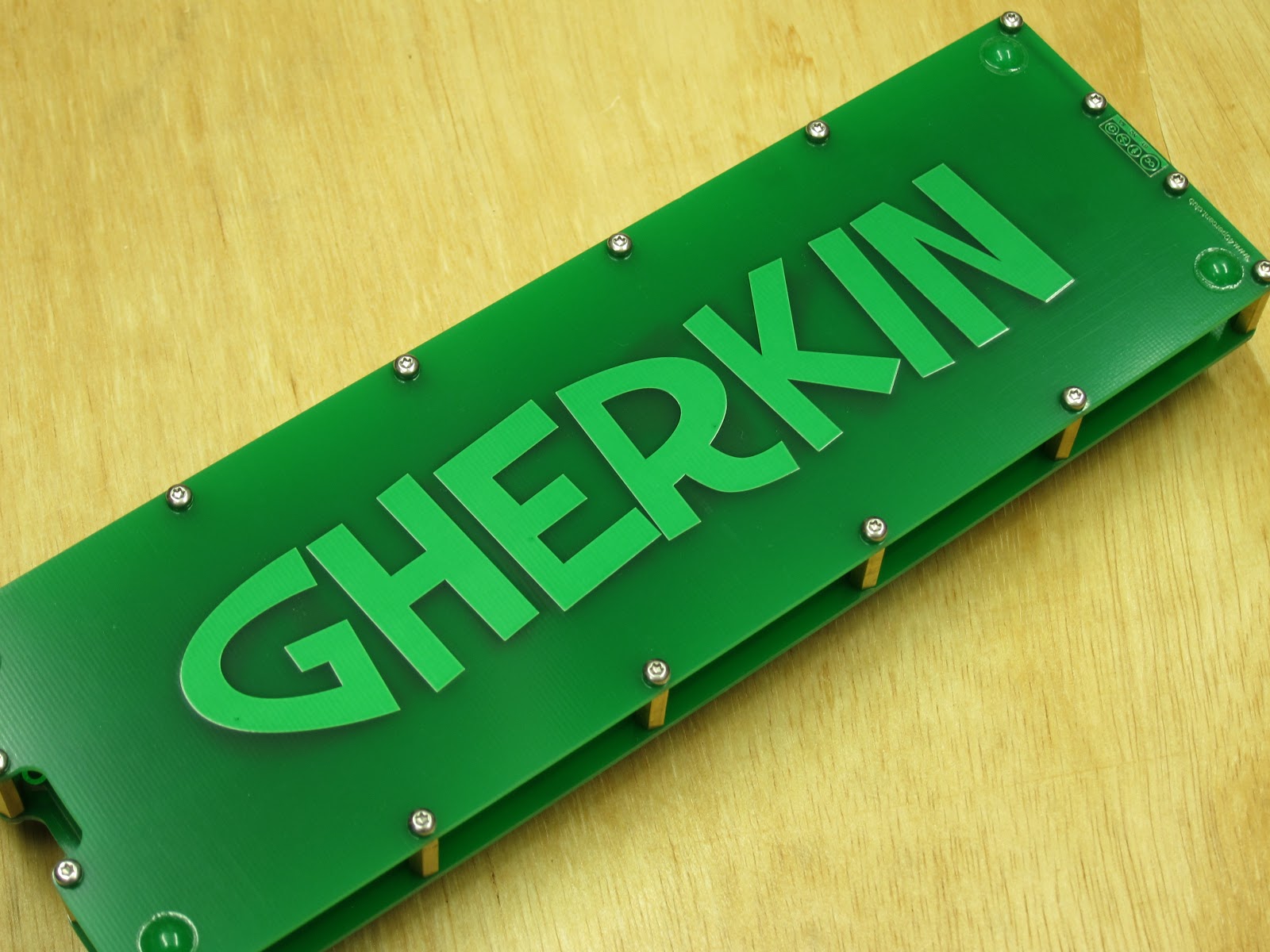 Same schematic as the Gherkin, running the same firmware.16mm is about as close as you can get the switches. There is a small gap horizontally, but vertically the switches are touching. Will have to test with other MX style switches. The milky white Gateron are a little narrower (15.35mm). Gateron beige SMT RGB are the widest (15.65mm).