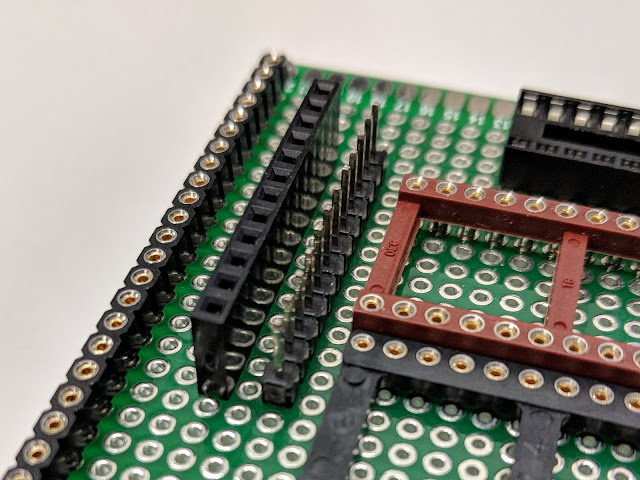Close up of the male and female pin headers. These are not IC sockets. They are board connectors for connecting two PCBs together. The male pins usually come with Pro Micros. The female receptacles you can order from electronics supply stores. They are very common on Arduino shields.